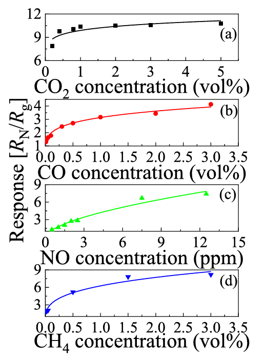 图 10. 多晶 β-Ga2O3 在 T = 650℃ 下对 (a) CO2、(b) CO、(c) NO 和 (d) CH4 浓度的响应。