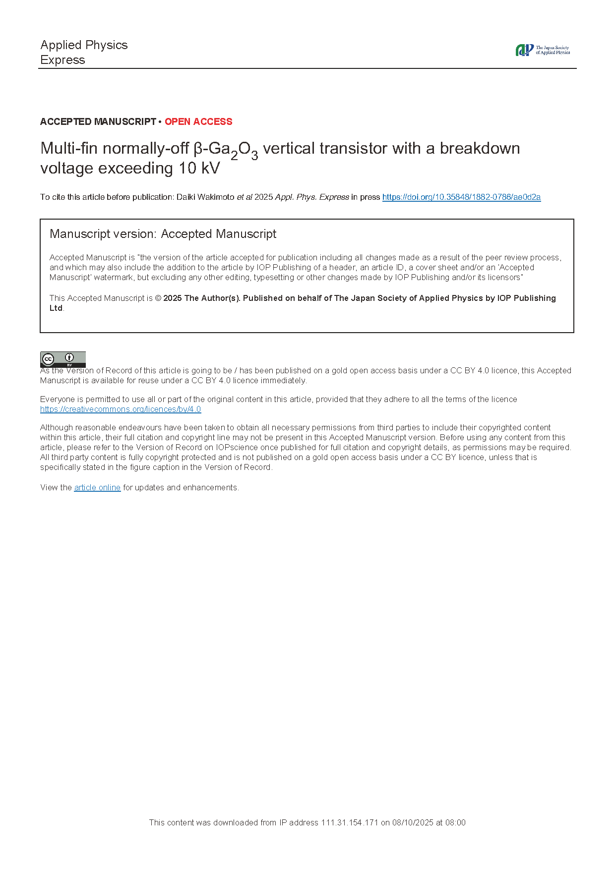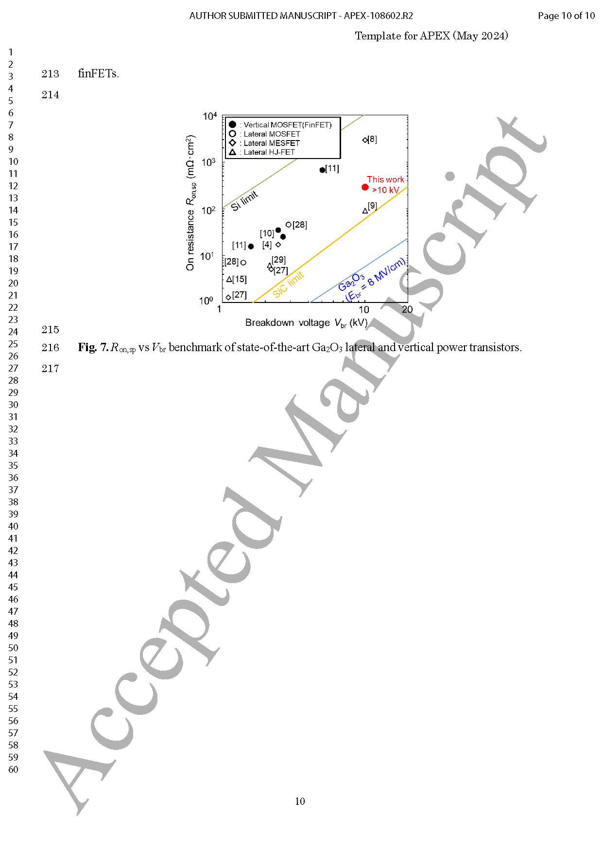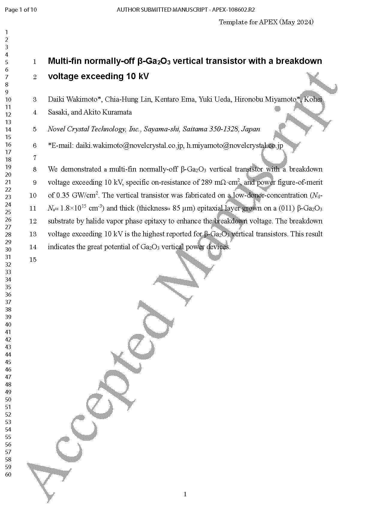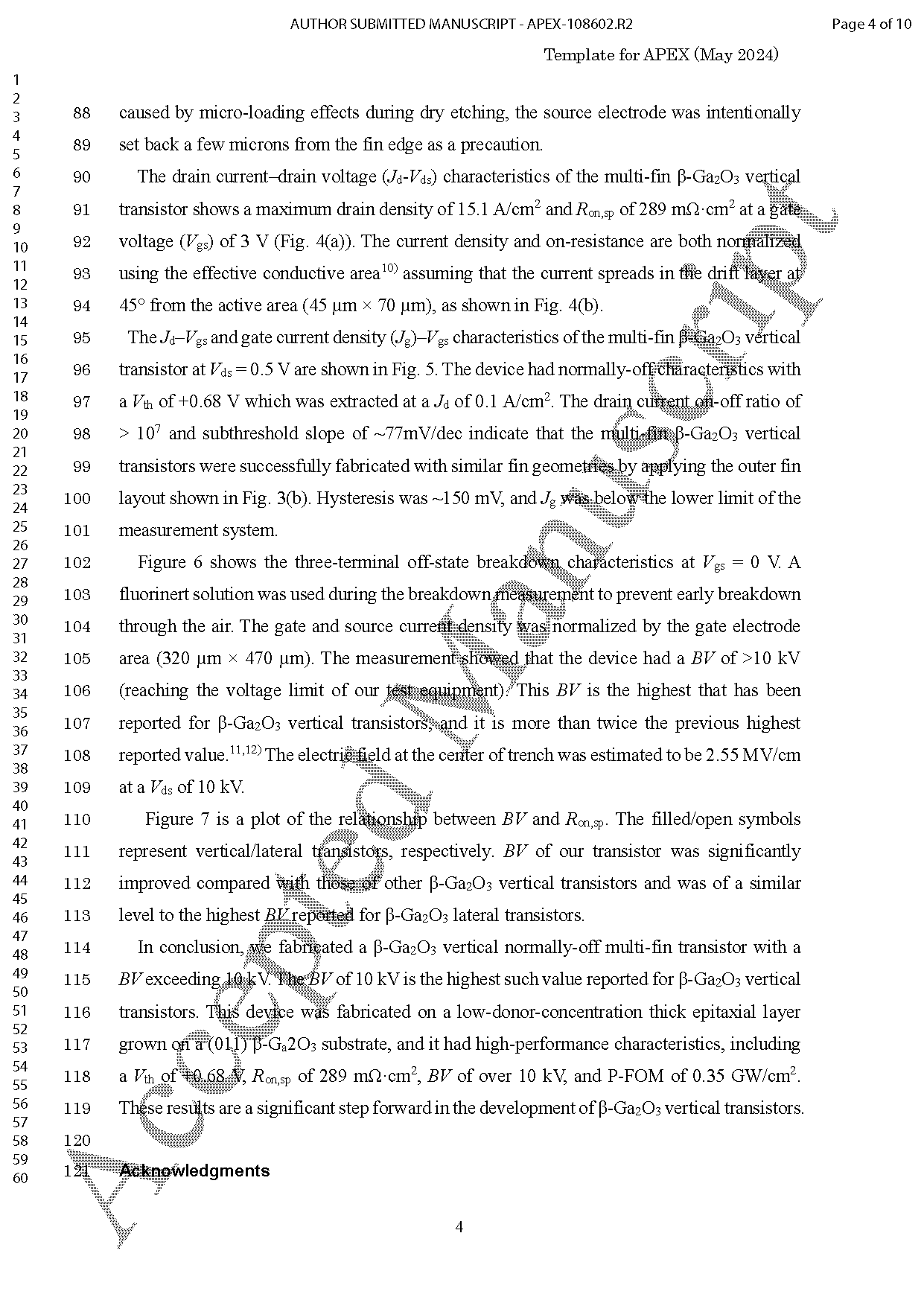 由日本NCT的研究团队在学术期刊 Applied Physics Express 发布了一篇名为 Multi-fin normally-off β-Ga2O3 vertical transistor with a breakdown voltage exceeding 10 kV(具有超过10kV击穿电压的Multi-fin常闭 β-Ga2O3 垂直晶体管)的文章。