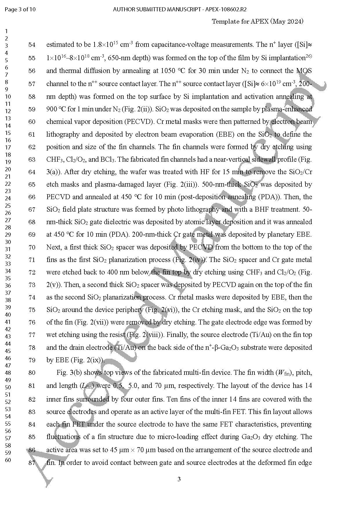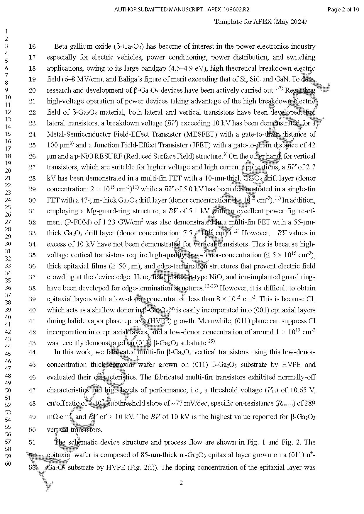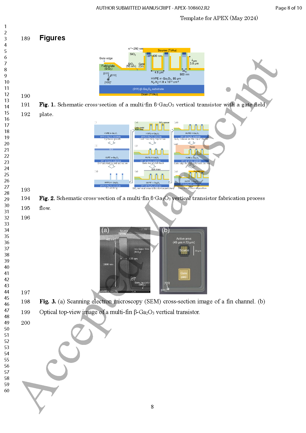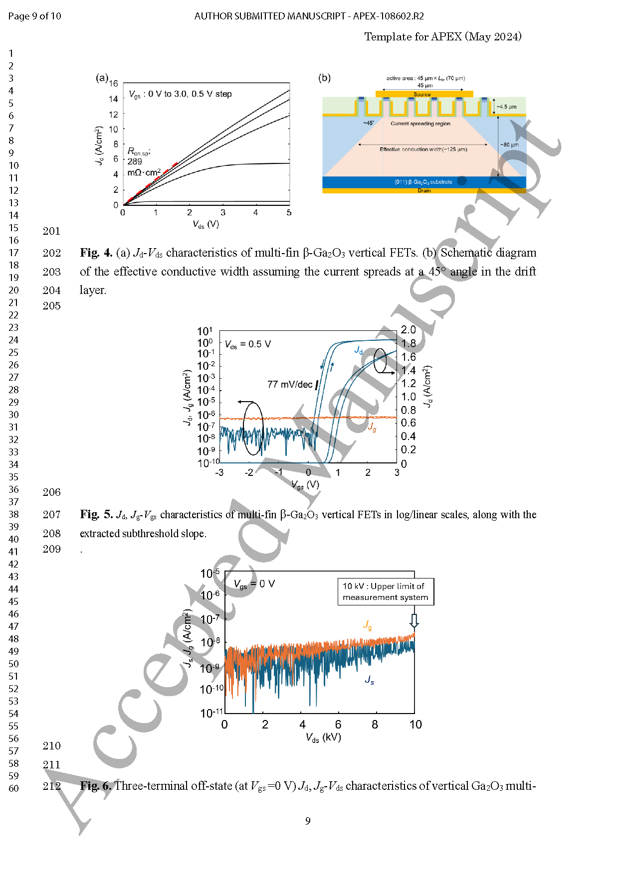 由日本NCT的研究团队在学术期刊 Applied Physics Express 发布了一篇名为 Multi-fin normally-off β-Ga2O3 vertical transistor with a breakdown voltage exceeding 10 kV(具有超过10kV击穿电压的Multi-fin常闭 β-Ga2O3 垂直晶体管)的文章。