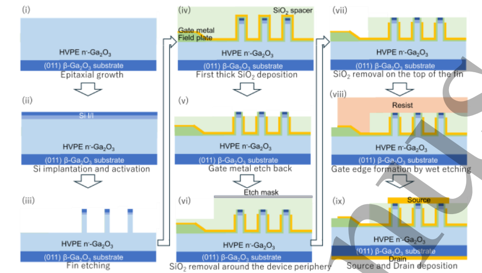 图 2. 多鳍 β-Ga2O3 垂直晶体管制备工艺流程示意横截面。