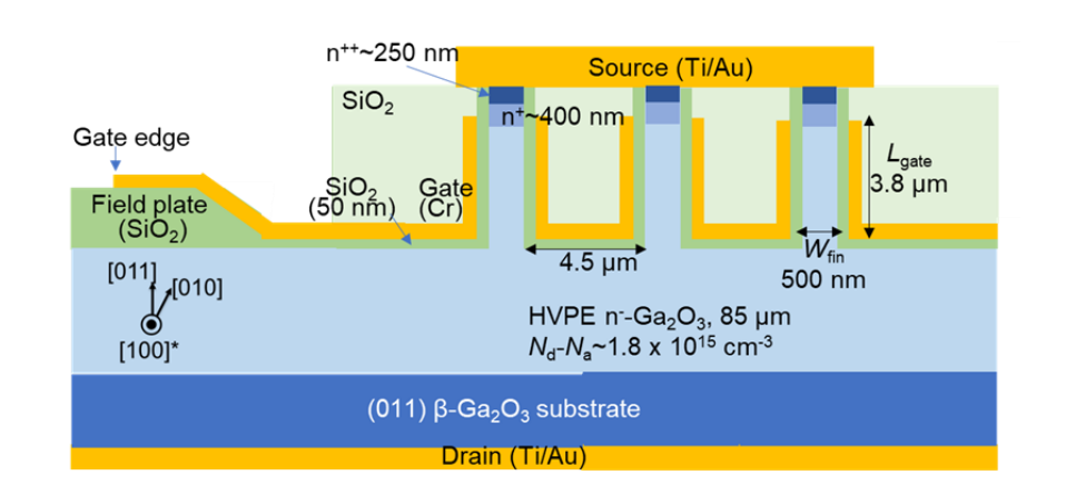 图 1. 带有栅极场板的多鳍 β-Ga₂O₃ 垂直晶体管示意横截面。