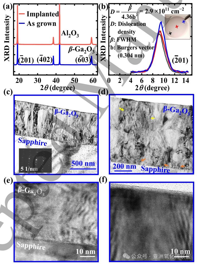 图2 (a)蓝宝石衬底上MOCVD生长的β-Ga₂O₃薄膜X射线衍射2θ-ω图谱;(b)Si⁺离子注入后β-Ga₂O₃的摇摆曲线,插图为晶圆全域测试点位;离子注入后β-Ga₂O₃/蓝宝石异质结横截面透射电镜图像:(c)整体形貌图,插图为选区电子衍射图谱;(d)位错分布情况,橙色箭头、黄色箭头分别指代界面失配位错与纵向位错;(e)界面高分辨透射电镜图;(f)近表层β-Ga₂O₃高分辨透射电镜图,展现出优异的结晶质量。