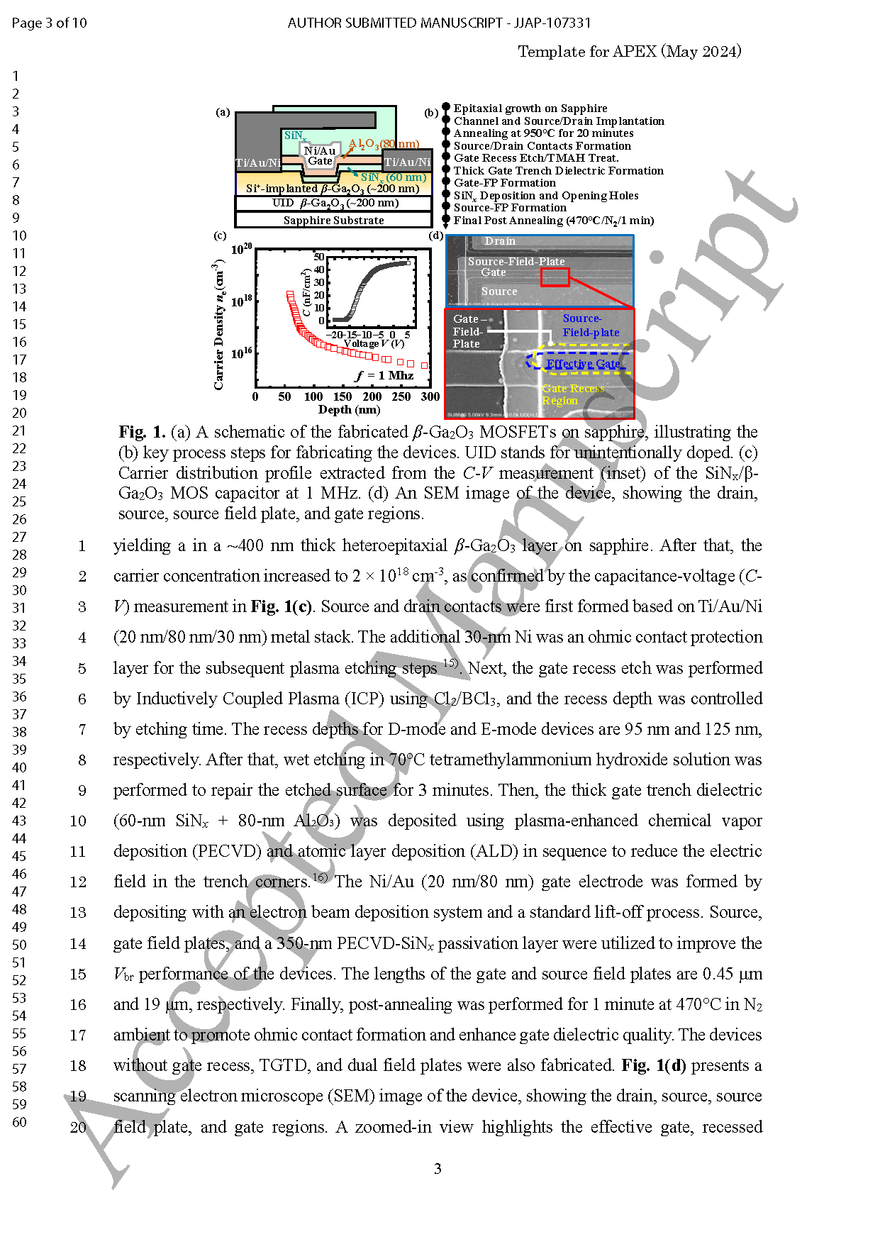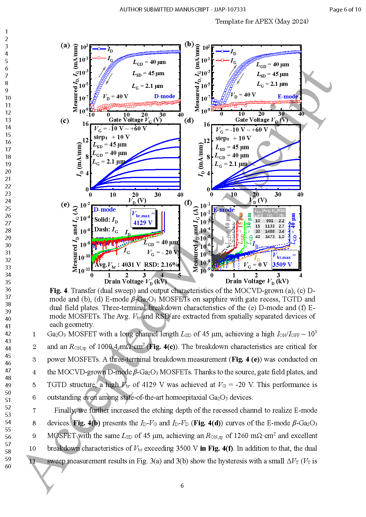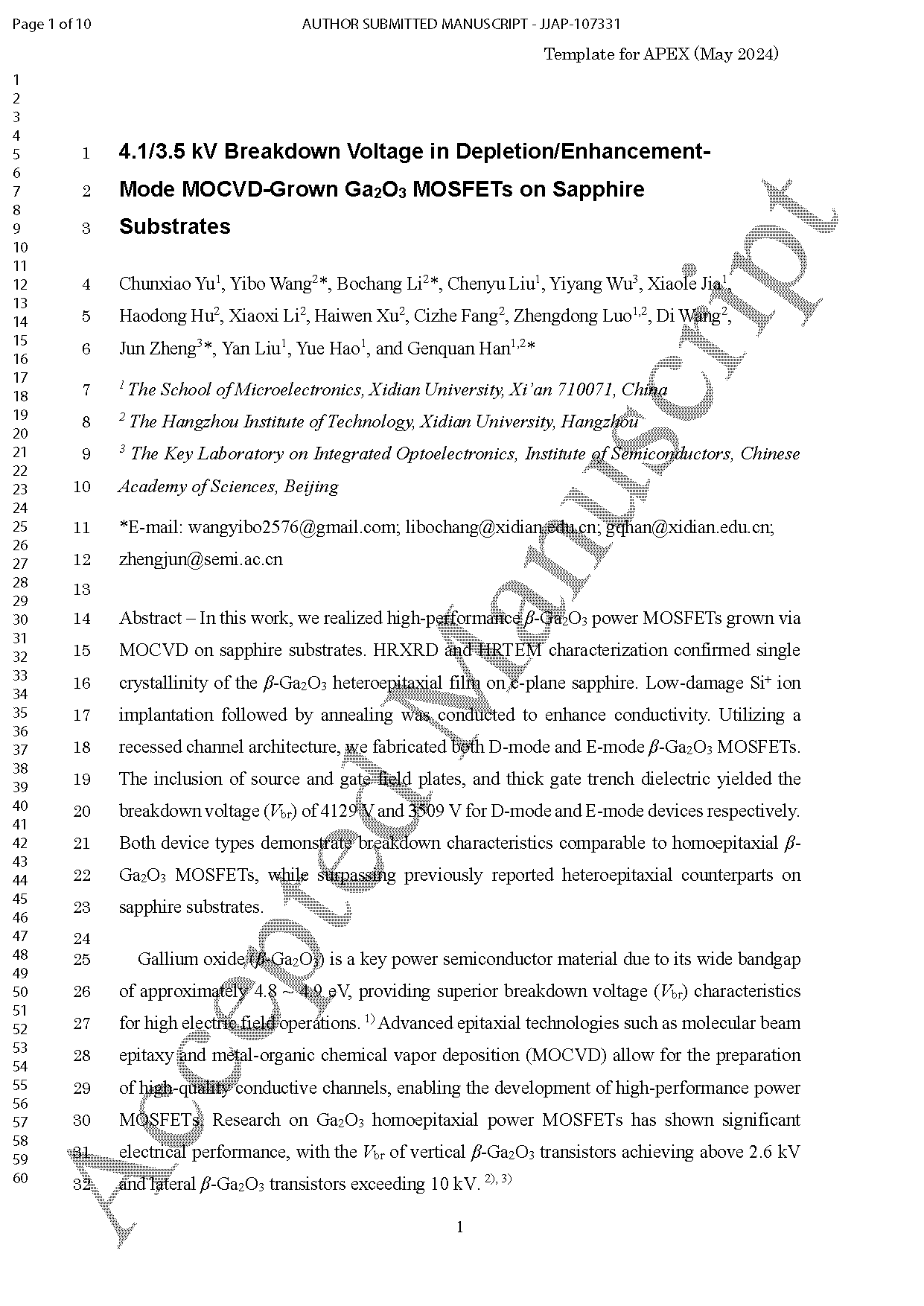 由西安电子科技大学郝跃院士、韩根全教授、王轶博副教授联合中科院半导体所郑军副研究员团队在学术期刊Japanese Journal of Applied Physics发布了一篇名为4.1/3.5 kV Breakdown Voltage in Depletion/Enhancement-Mode MOCVD-Grown Ga₂O₃ MOSFETs on Sapphire Substrates(蓝宝石衬底上 MOCVD 生长的耗尽型/增强型 β-Ga₂O₃ MOSFET 实现 4.1/3.5 kV 击穿电压)的文章。