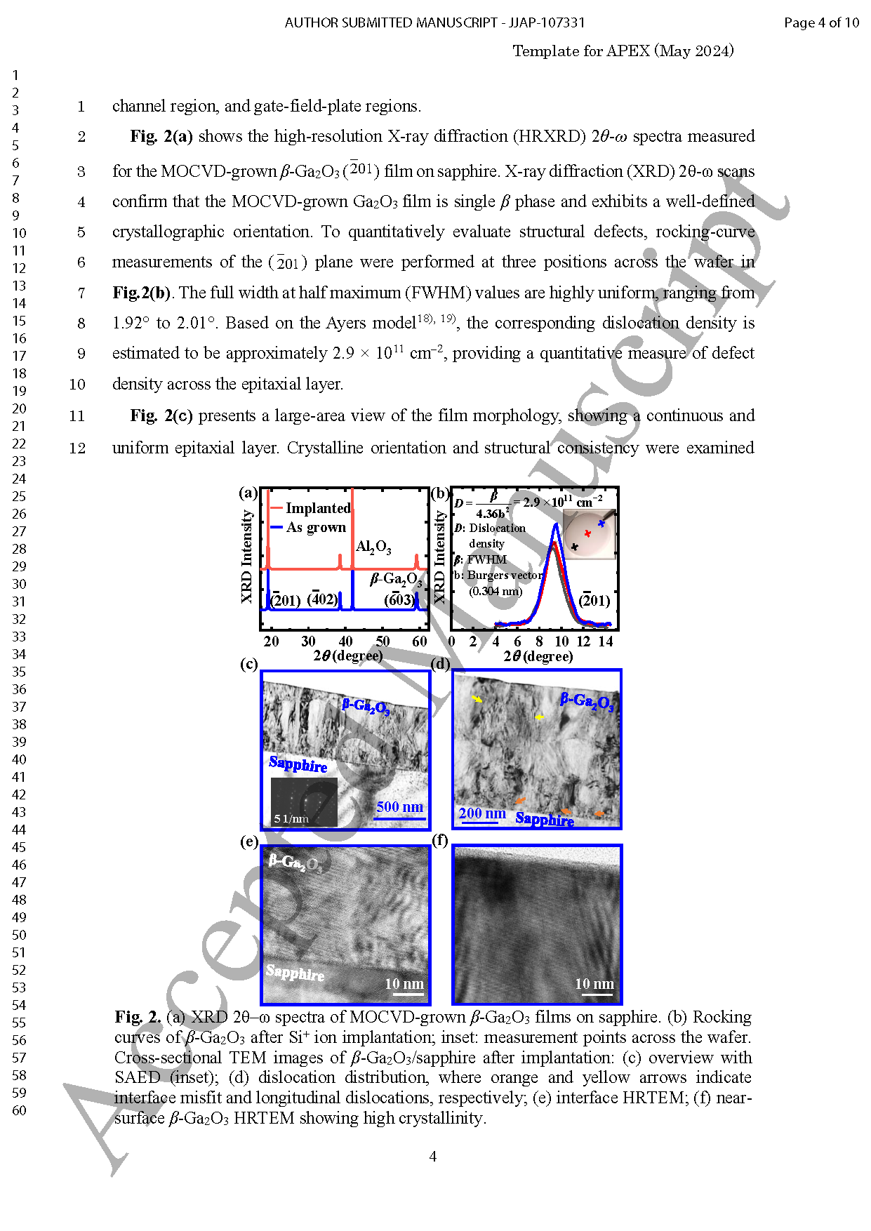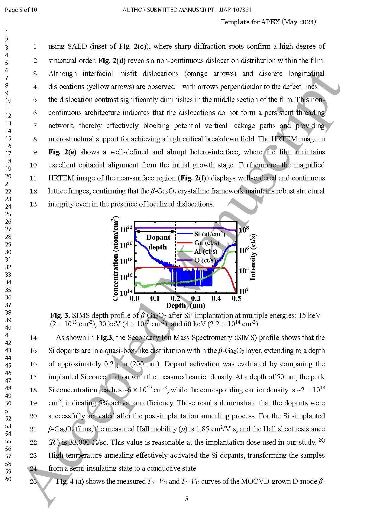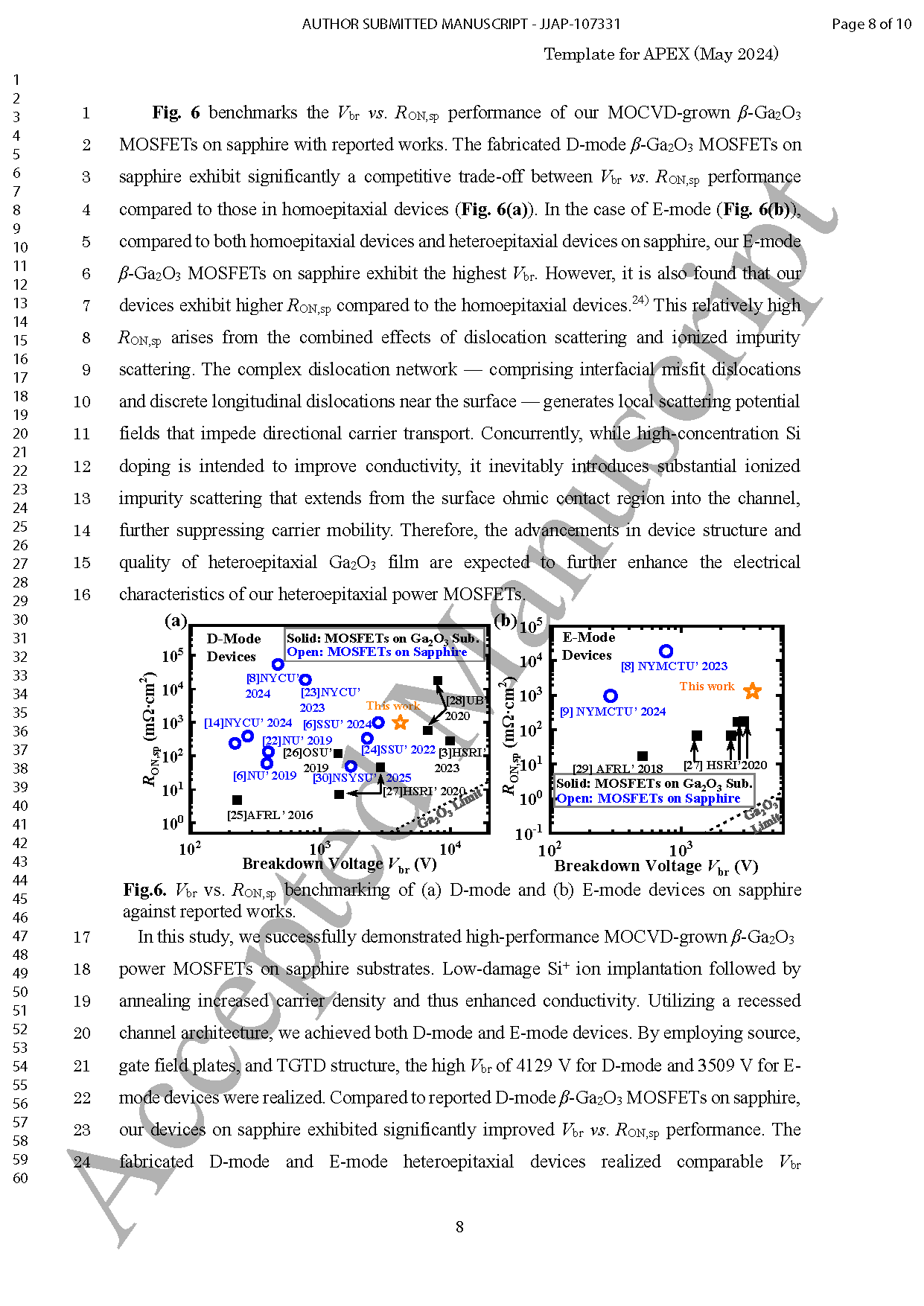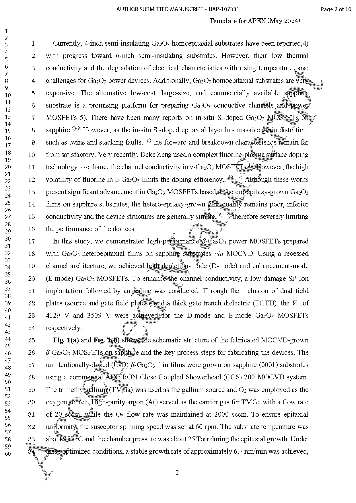 由西安电子科技大学郝跃院士、韩根全教授、王轶博副教授联合中科院半导体所郑军副研究员团队在学术期刊Japanese Journal of Applied Physics发布了一篇名为4.1/3.5 kV Breakdown Voltage in Depletion/Enhancement-Mode MOCVD-Grown Ga₂O₃ MOSFETs on Sapphire Substrates(蓝宝石衬底上 MOCVD 生长的耗尽型/增强型 β-Ga₂O₃ MOSFET 实现 4.1/3.5 kV 击穿电压)的文章。