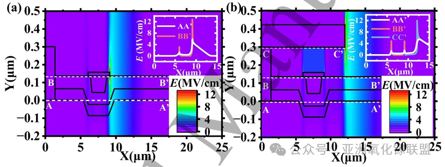 图5 栅漏间距(LGD)为40 μm的蓝宝石基耗尽型(D-mode)β-Ga₂O₃ MOSFET,Sentaurus TCAD电场仿真结果:(a)无源性场板、漏极电压VD =2.6 kV条件下的电场分布;(b)带有源极场板、漏极电压VD =4.2 kV条件下的电场分布。插图为截线处的电场分布曲线。