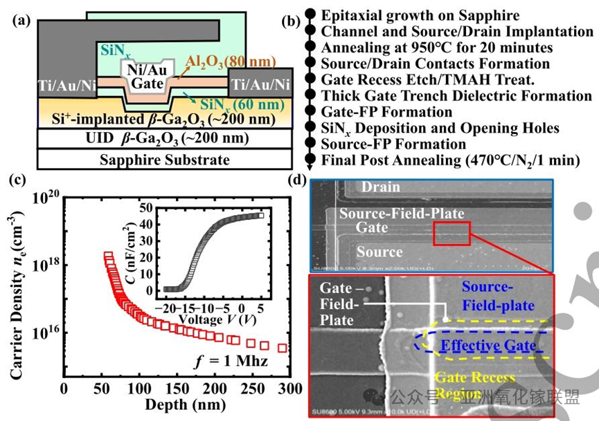 图1 (a)蓝宝石衬底上制备的β-氧化镓(β-Ga₂O₃)金属氧化物半导体场效应晶体管(MOSFET)结构示意图;(b)器件核心制备工艺步骤,其中UID指代非故意掺杂;(c)1 MHz频率下,通过SiNₓ/β-Ga₂O₃ MOS电容的电容-电压(C-V)测试(插图)提取得到的载流子分布曲线;(d)器件扫描电子显微镜(SEM)图像,标注出漏极、源极、源极场板及栅极区域。