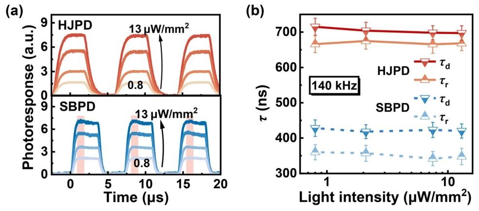 图3. (a) 140 kHz 下不同入射光功率密度的 SBPD 与 HJPD 瞬态光响应;(b) 不同光功率密度下提取的上升(τr)和衰减(τd)时间常数
