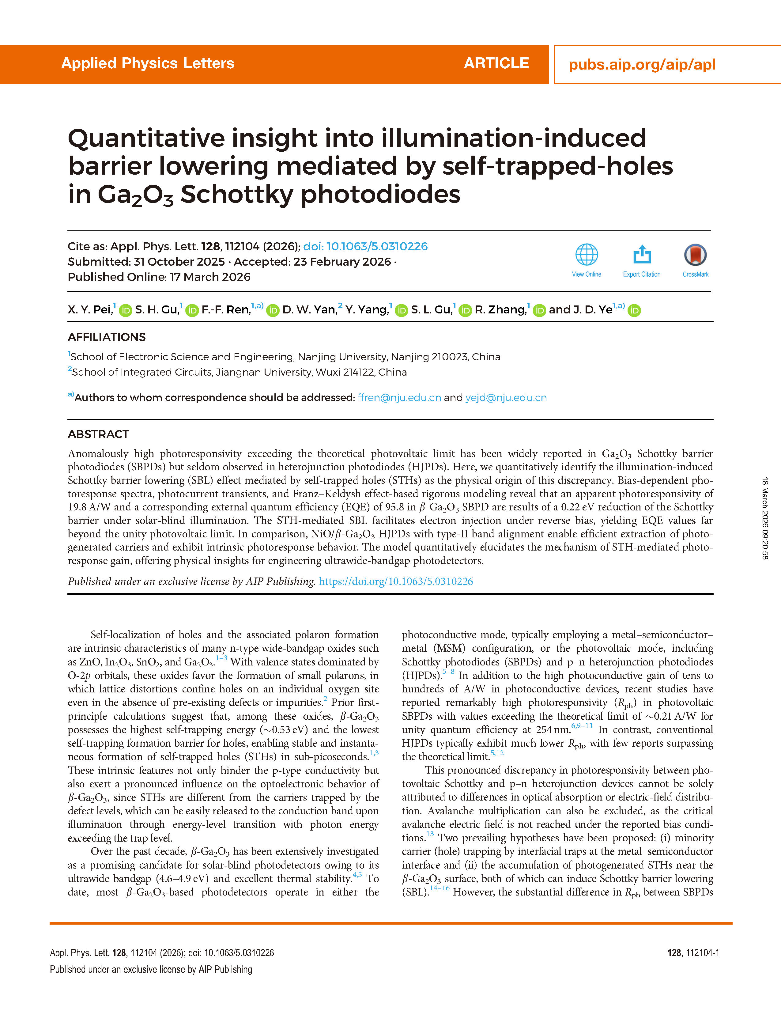 由南京大学电子科学与工程学院叶建东教授联合江南大学集成电路学院的研究团队在学术期刊Applied Physics Letters上发布了一篇名为Quantitative insight into illumination-induced barrier lowering mediated by self-trapped-holes in Ga₂O₃ Schottky photodiodes(自陷空穴介导的光照诱导势垒降低效应在 Ga₂O₃ 肖特基光电二极管中的定量研究)的文章。