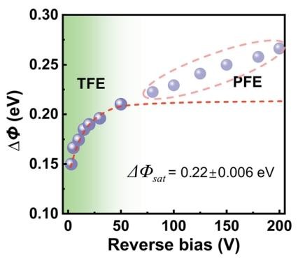 图5. 肖特基势垒降低量(ΔΦ)随施加反向偏压的变化;粉色虚线为经验指数拟合曲线